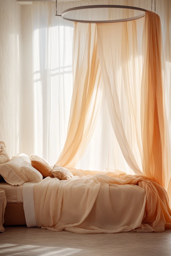 Picture sheer, flowing fabrics in neutral or warm tones cascading from a ceiling-mounted ring or frame. The fabric gently pools around the bed, creating a romantic, castle-like effect. The soft folds catch the light, adding a sense of depth and intimacy. When paired with textured linens and vintage accents, the canopy elevates the entire aesthetic to a luxurious, old-world charm.
