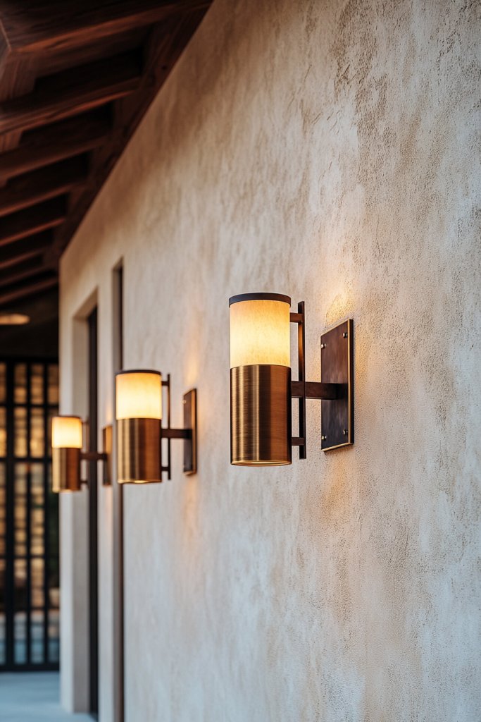 Imagine sleek, minimalist sconces with warm metal finishes mounted on textured or painted walls. The soft glow from these fixtures highlights architectural details and creates gentle pools of light. The warm tones of brass or bronze complement earthy palettes, reinforcing the Mediterranean aesthetic. The fixtures’ understated elegance adds a layer of sophistication without overwhelming the space.