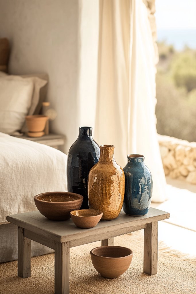 Want to incorporate the charm of Italian craftsmanship without the hassle of green plants or flowers? Decorative ceramic vases and pottery offer a stylish, low-maintenance way to add character to your bedroom. They highlight artisanal skills and earthy textures, fitting beautifully into a Mediterranean aesthetic. It’s about celebrating craftsmanship without green thumbs.