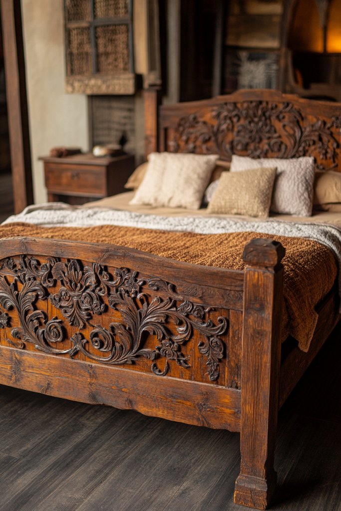 Choose a dark mahogany or weathered oak for a more antique vibe, or opt for lighter pine for a fresher, country feel. You can add a canopy with flowing curtains for a romantic touch or keep it simple and rustic. For smaller rooms, a carved headboard can serve as a focal point without overwhelming the space. Layering with vintage bedding and textured throws enhances the artisanal feel.
