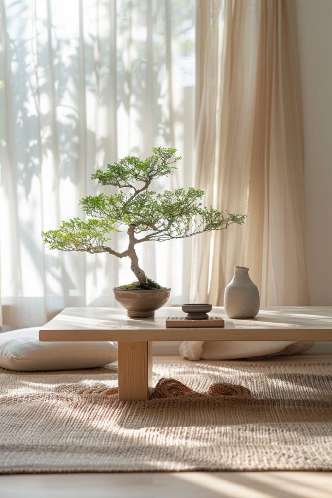 Grouping plants of varying heights can add depth and interest, while staying true to the Japandi principle of balance. You might also want to choose plants with sculptural forms, like a ZZ plant, for a striking focal point. Ultimately, these natural elements will enhance your space, making it feel more inviting and tranquil.