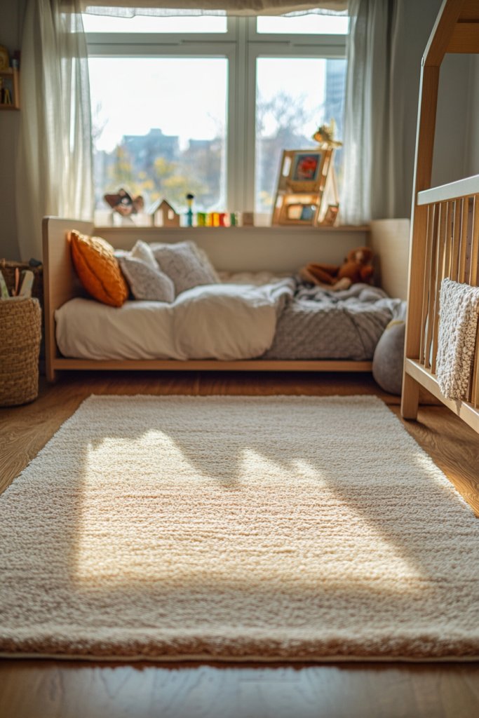 Visualize a plush, patterned rug in bright colors or gentle pastels, covering a designated play zone. Textured fabrics like shag or chunky knits add tactile interest, making the space inviting for bare feet. The rug anchors the room, defining a cozy corner for fun and relaxation.