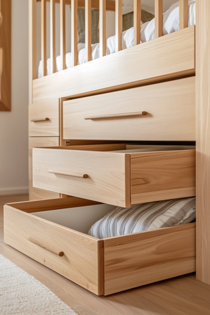 Picture sleek, spacious drawers sliding smoothly beneath a cozy bed frame. The drawers are made from durable materials, with colorful fronts that match the room’s decor. Kids can easily pull them out to find their favorite toys or clothes, turning clutter management into a game.