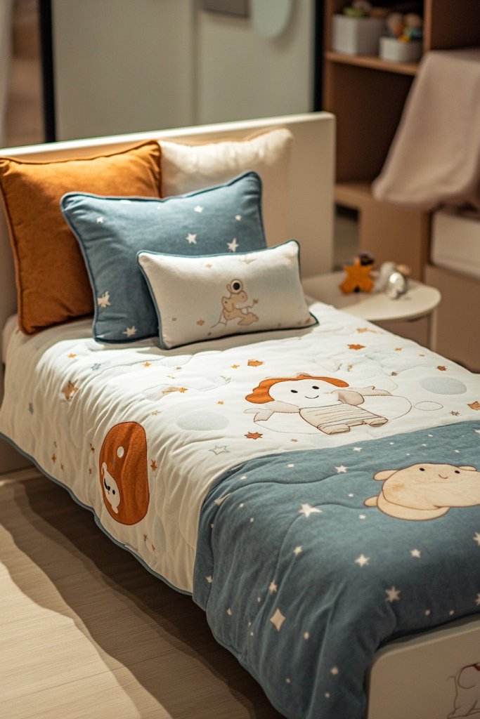 Envision bright, playful bedding featuring characters from movies, animals, or geometric patterns that tie the room together. Layer with matching pillowcases, throws, and curtains for a cohesive look. Textured fabrics like quilted or embroidered designs add depth and comfort, transforming the bed into a focal point.