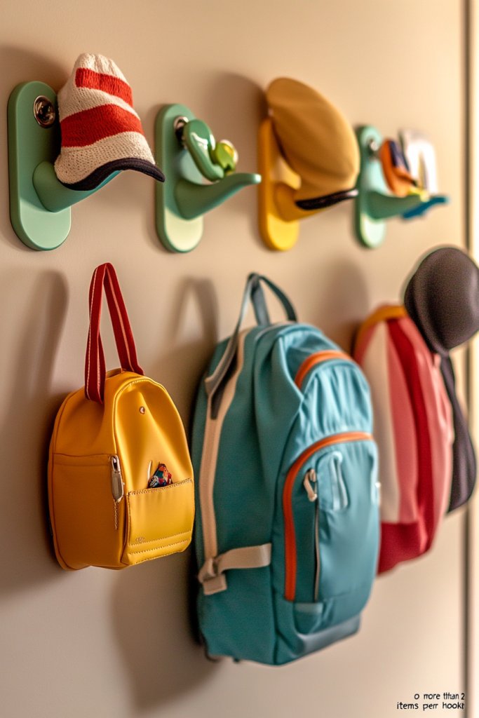 Imagine a wall lined with cheerful hooks shaped like animals, stars, or clouds in bright, fun colors. Each hook holds a favorite toy, backpack, or hat, making everything look intentional and lively. The hooks are mounted at kid-friendly heights, so little hands can easily hang and grab their belongings. The wall behind is painted in a lively hue that complements the hooks, transforming an ordinary space into a playful display.