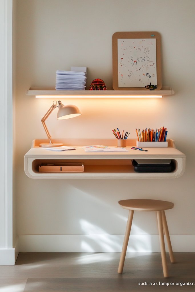 Choose a fold-down desk in bright or pastel tones to match your child’s personality. For small spaces, opt for a corner-mounted version that maximizes room. For older kids, a larger surface with integrated storage makes sense. You can also incorporate a bulletin board or magnetic strip on the wall above for notes and inspiration. Seasonal accessories like themed decals or stickers can make the workspace more inviting.