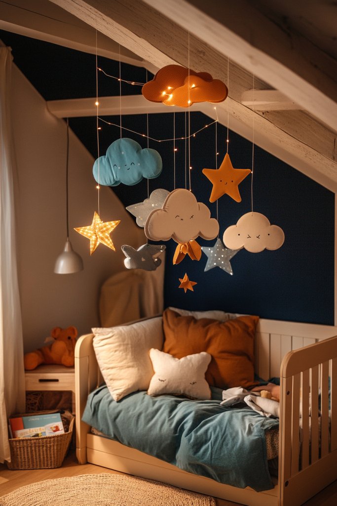 Use themes that match the room’s decor—stars, animals, planets, or abstract shapes. For a calming vibe, stick to soft pastel shades and simple designs; for a lively feel, opt for bold hues and layered textures. Vary the length of hanging elements to add dimension. Consider incorporating sensory elements like crinkle fabric or shiny surfaces for added stimulation.
