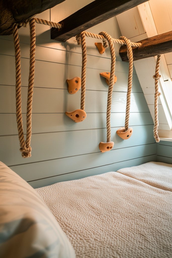 Picture a sturdy rope ladder hanging beside a bed or a colorful climbing wall painted with chalkboard sections. The textured ropes or grips invite kids to climb, swing, and explore safely. Bright colors and playful designs make the feature both functional and fun, encouraging physical activity.