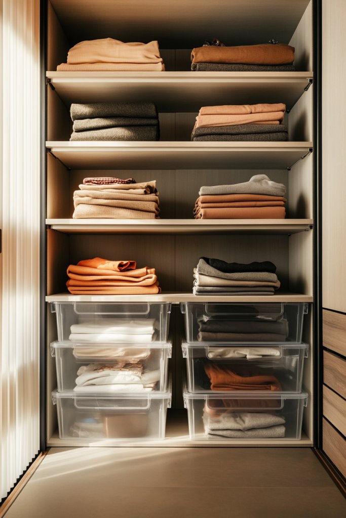 Picture a sleek, open wardrobe with multiple shelves filled with transparent bins. Each bin holds specific items—socks, pajamas, or accessories—and can be easily pulled out or replaced. The clear containers allow your kid to see exactly what’s inside, encouraging them to keep things tidy. The open design makes the room feel larger and more inviting, turning organization into a visual delight.