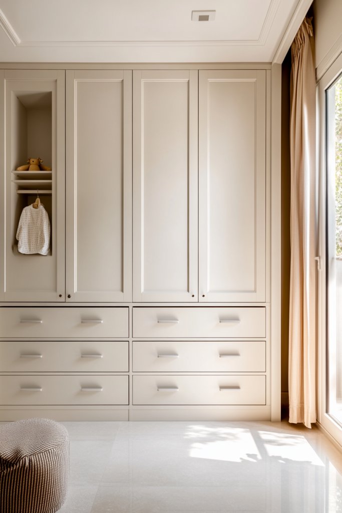 Choose finishes like matte paint, high gloss, or wood veneer for a sophisticated look. Incorporate push-to-open mechanisms, so doors and drawers open with a gentle push. Use subtle color schemes—monochrome or neutral tones—to enhance the minimalist vibe. This design is perfect for modern or Scandinavian-style rooms and can be customized to grow with your child.