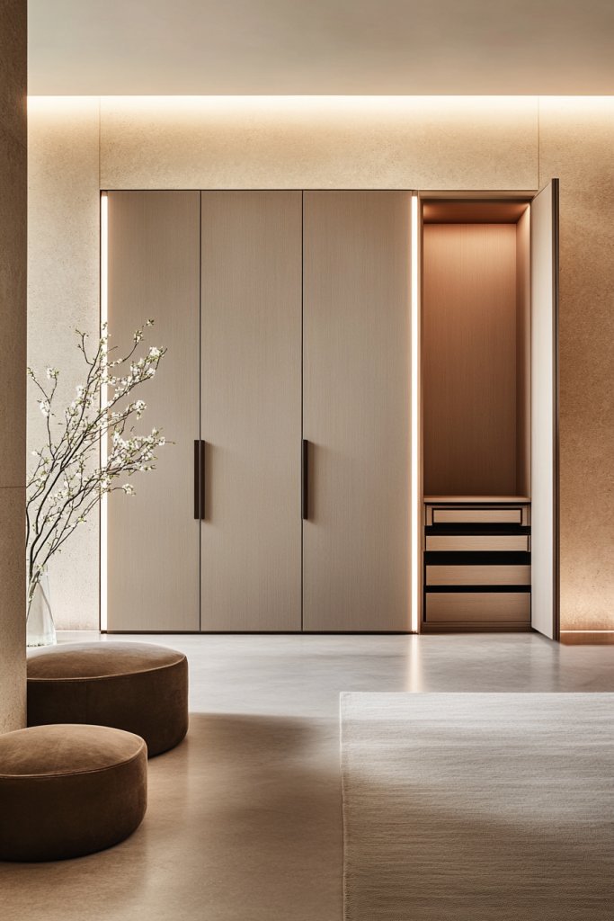 Imagine a streamlined wardrobe with smooth, flat panels—no visible handles or hardware. When opened, discreet compartments slide out or pop up, revealing organized shelves, drawers, or secret cubbies. The entire unit looks sleek and modern, with a clean aesthetic that makes the room appear larger and calmer. Hidden compartments keep everything out of sight but easily accessible.