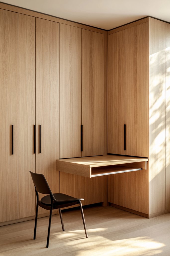 Picture a sleek wardrobe with a fold-down desk integrated into the side panel. When closed, it looks like a modern wardrobe with clean lines and colorful accents. When opened, the panel folds down to reveal a compact desk surface with built-in compartments for stationery and books. The entire setup cleverly combines storage, study space, and a tidy appearance, transforming the room into a multifunctional hub.