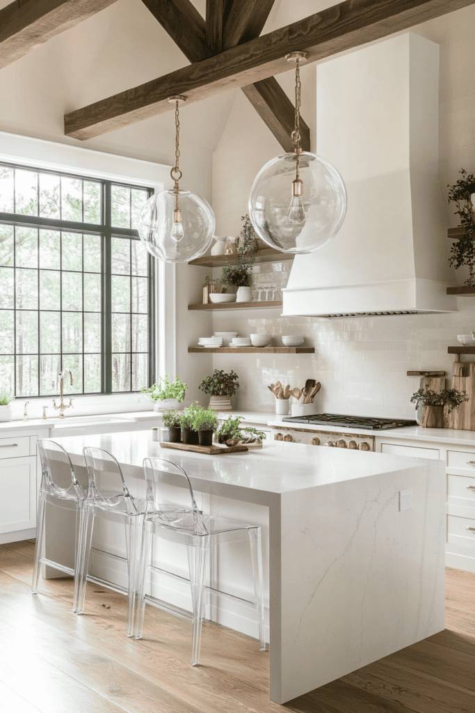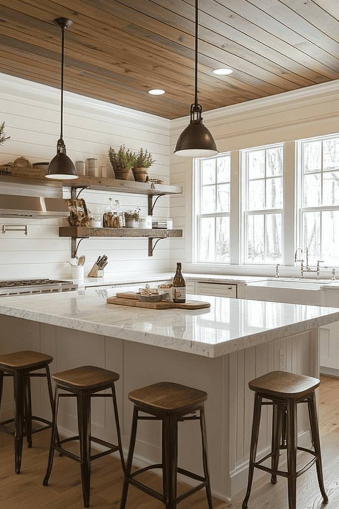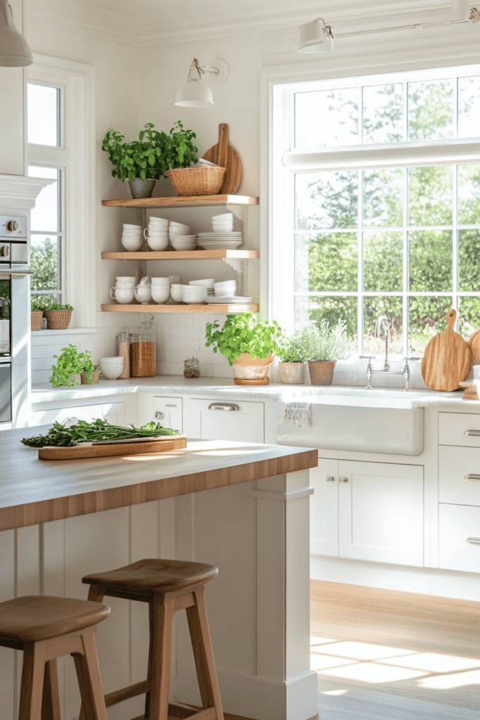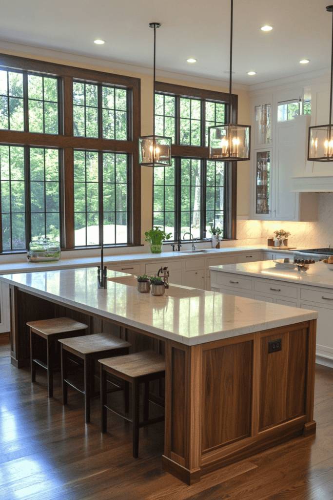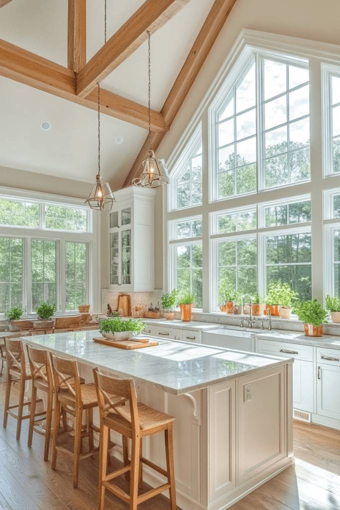 Don’t forget the details—vintage-inspired light fixtures and classic subway tiles can elevate the overall aesthetic. With ample natural light pouring in through large windows, your kitchen becomes a bright, cheerful hub that beautifully marries modern comfort with timeless farmhouse charm.
