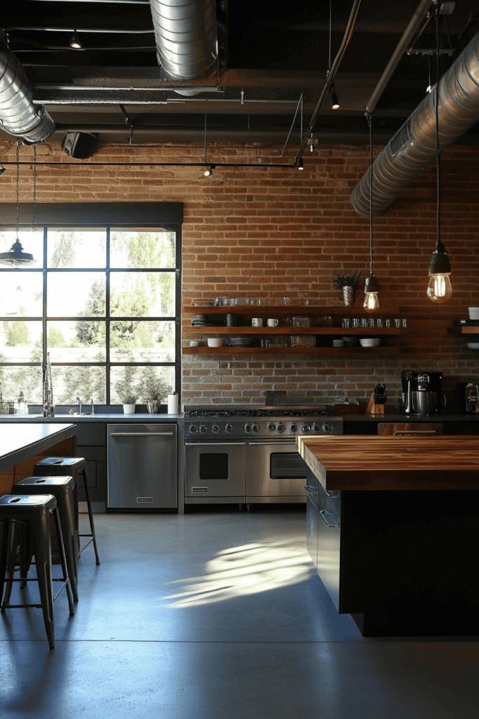 If contemporary kitchens embrace sleek minimalism, industrial style takes a bold step in the opposite direction, celebrating raw materials and an unfinished aesthetic. You’ll find exposed brick walls and reclaimed wood elements that add character and warmth, creating a space that feels both inviting and edgy. Think stainless steel appliances paired with rugged fixtures, like vintage pendant lights or pipe shelving, which contribute to that urban vibe.