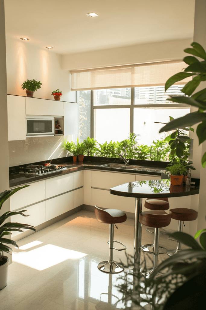 Incorporating sleek countertops and open shelving enhances the visual appeal, while modern appliances tucked away in lower levels keep everything organized. You can also add pendant lighting above the dining area to create an inviting ambiance.