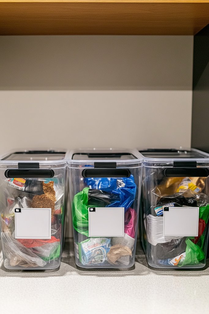 Picture a set of stylish, transparent baskets or bins with bold labels like ‘Recycling,’ ‘Compost,’ and ‘Trash.’ They sit neatly in a designated corner or under the sink, with the labels facing outward. The clear design lets you see contents at a glance, encouraging proper disposal without searching or second-guessing.