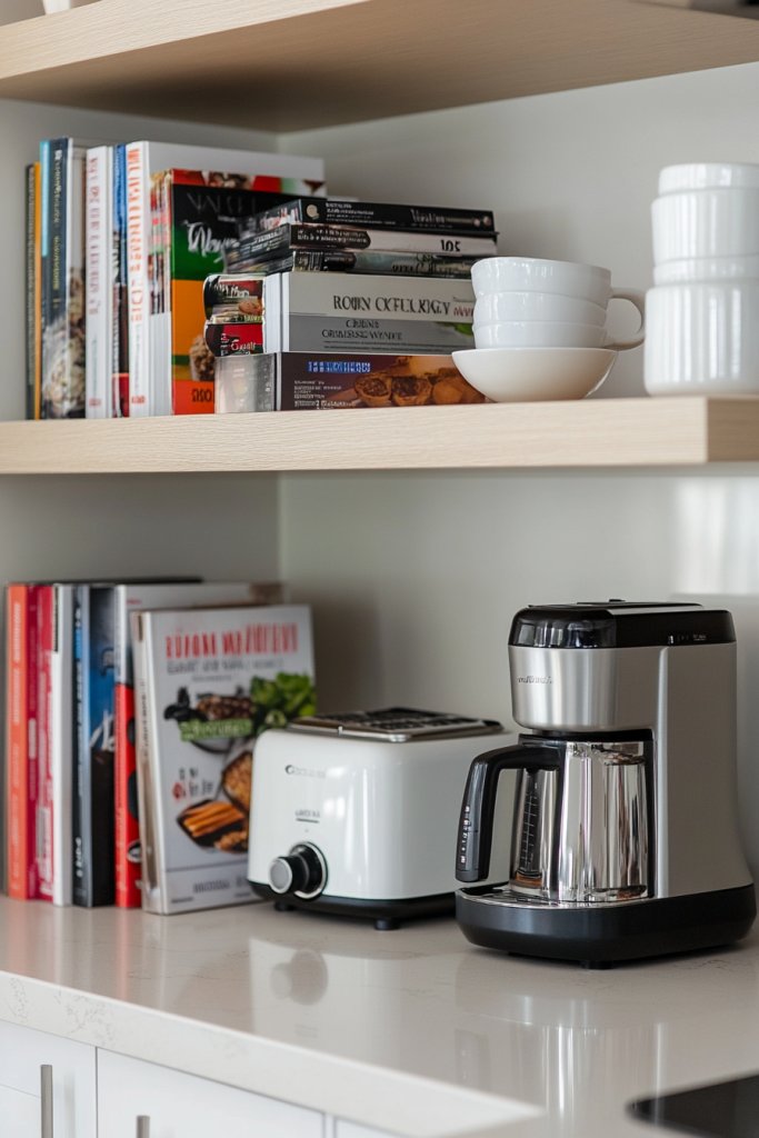 Imagine a set of sleek, modular shelves stacking on top of each other, holding blenders, toasters, and a row of cookbooks. The layered setup adds height and depth to your countertop, making everything easy to reach. The open design allows you to display your favorite cookbooks while keeping appliances ready for action.