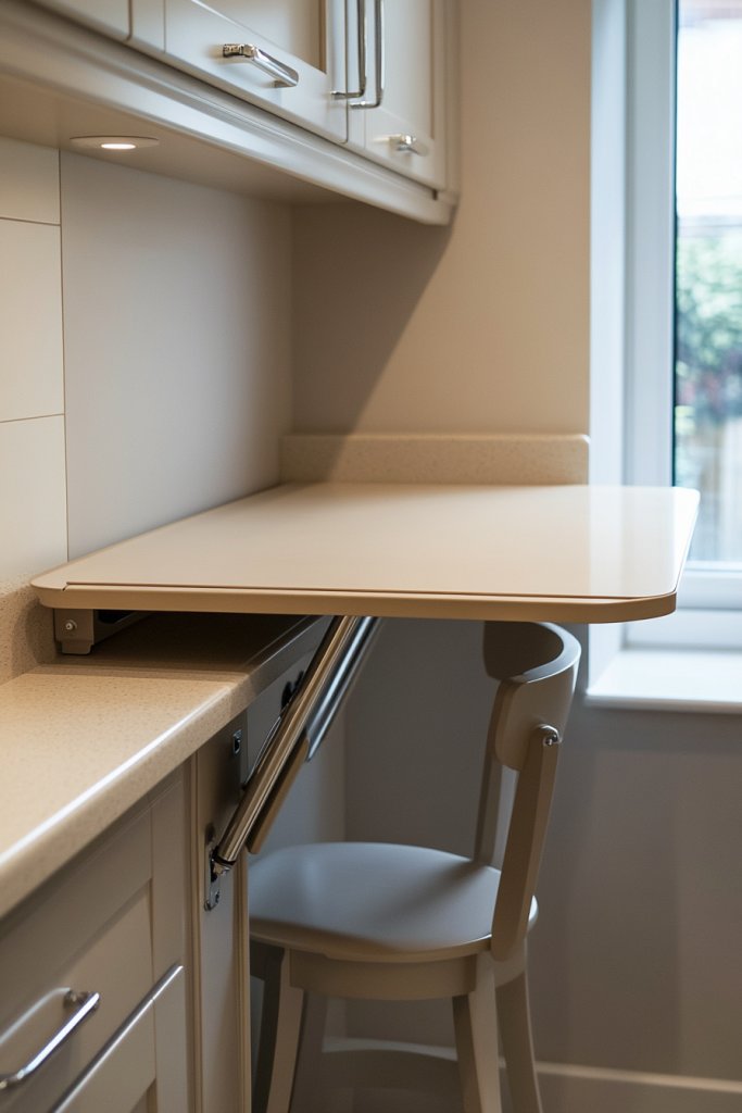 A fold-down table offers flexible space that adapts to your lifestyle, whether for extra prep, dining, or crafts. It brings a sense of innovation and practicality to your kitchen. Once installed, you’ll wonder how you ever managed without this space-saving feature. It’s a game-changer for small kitchens or multi-use areas.