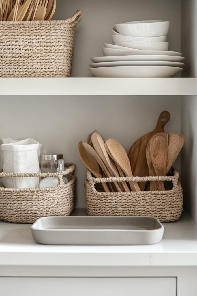 Visualize a collection of woven or ceramic baskets holding snacks, napkins, or utensils, arranged neatly on open shelves or countertops. Decorative trays display your everyday items in a curated, intentional way. The mix of textures and materials creates visual interest, making your kitchen feel warm and welcoming.