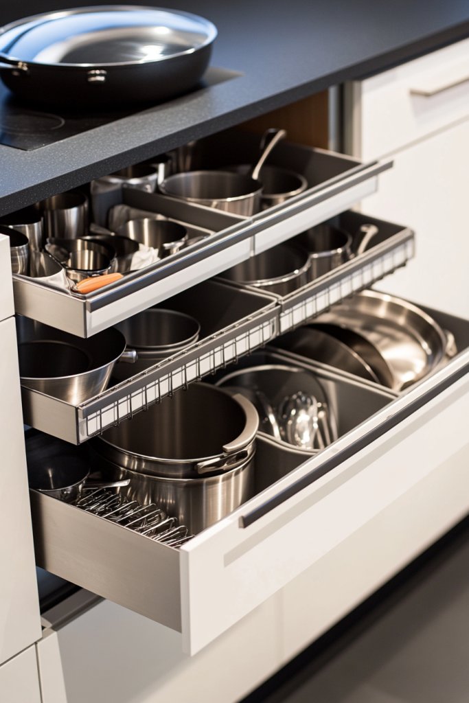Picture sliding wooden or metal drawers that smoothly glide out, revealing neatly arranged pots, pans, or small appliances. The drawers are deep enough to hold bulky items and are fitted with dividers for utensils. When opened, you see everything at eye level, eliminating that frustrating crouch-and-search routine. Bright LED lighting inside these drawers makes items pop, even in dim corners.