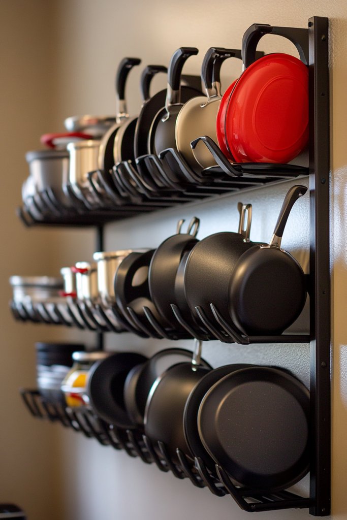 Picture a sleek metal or wooden rack installed above your stove or along a blank wall, with hooks holding pots, pans, and their matching lids. The cookware hangs in a cascading display, showing off your favorite pieces. The open arrangement creates a professional, restaurant-inspired vibe, while keeping everything within arm’s reach.