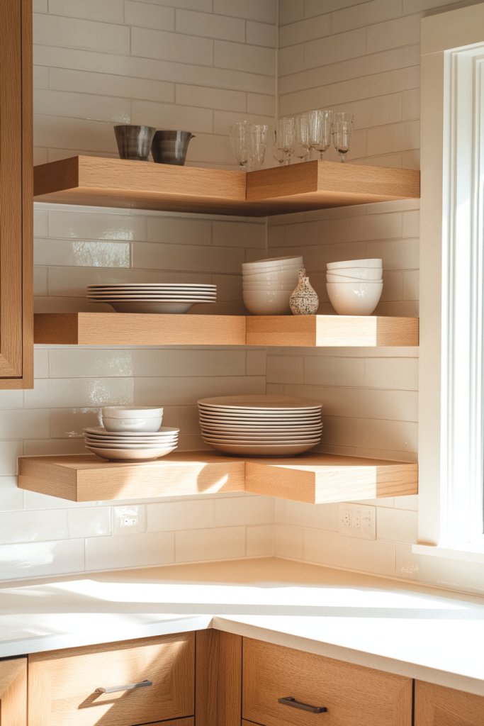 Picture sleek wooden or painted shelves against a backdrop of textured walls. Imagine neatly arranged bowls, cups, and decorative jars that add color and character. The open display allows natural light to bounce around, making the room feel brighter. Visualize how this simple change transforms your kitchen into a stylish yet functional space.