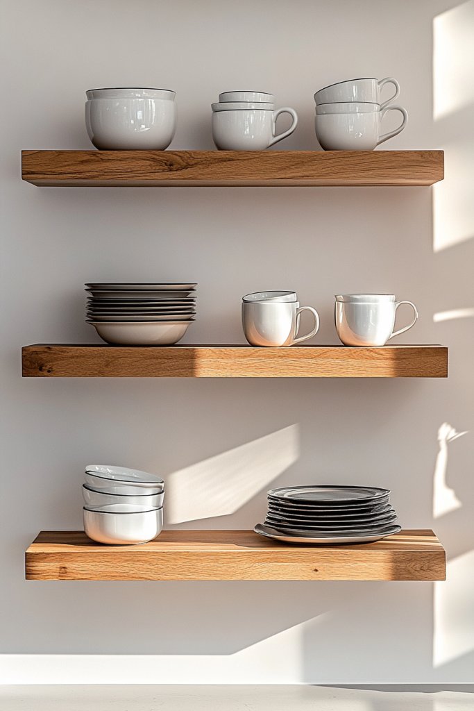 Imagine sleek wooden shelves mounted on a crisp, white wall. Brightly colored plates and glassware sit neatly aligned, catching the light and adding vibrancy. A soft glow from under-cabinet LEDs highlights your artful arrangement. Textured ceramics and minimalist bowls create a layered, inviting display. It’s a blend of function and art that transforms your space.