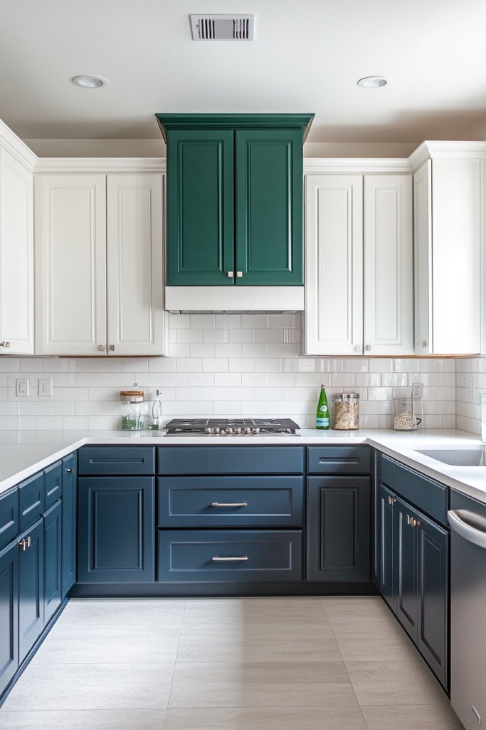 Picture dark navy lower cabinets paired with crisp white uppers, or sleek black bases with light gray tops. The contrast highlights functional zones like prep and storage areas. Textured finishes or matte paint add depth, while glossy accents bring a modern touch. Bright hardware or trim pops against bold colors, completing the look. It’s a timeless style that turns heads.