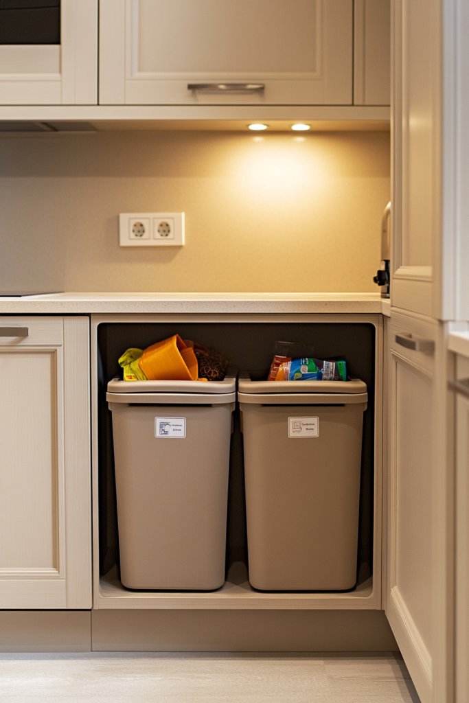 Picture a sleek, concealed cabinet with labeled bins for recyclables, compost, and trash. The bins are stackable or side-by-side for efficient use of space. A pull-out mechanism makes sorting effortless, while a counter-height countertop keeps everything accessible. The design blends seamlessly into your cabinetry, maintaining a clean look.