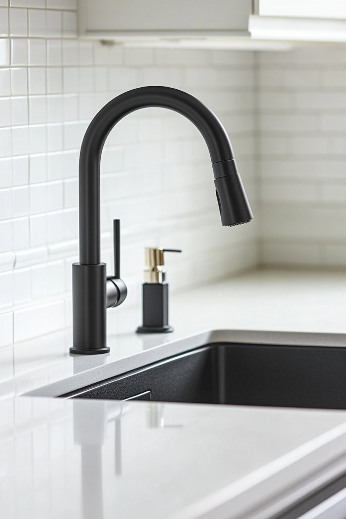 Visualize a sleek, high-arc faucet in brushed nickel or matte black, with a flexible hose that extends effortlessly. The pull-down head offers multiple spray options, from steady stream to powerful rinse. Its minimalist design complements any style, from farmhouse to modern. The smooth surface resists fingerprints and water spots, keeping your sink area pristine.