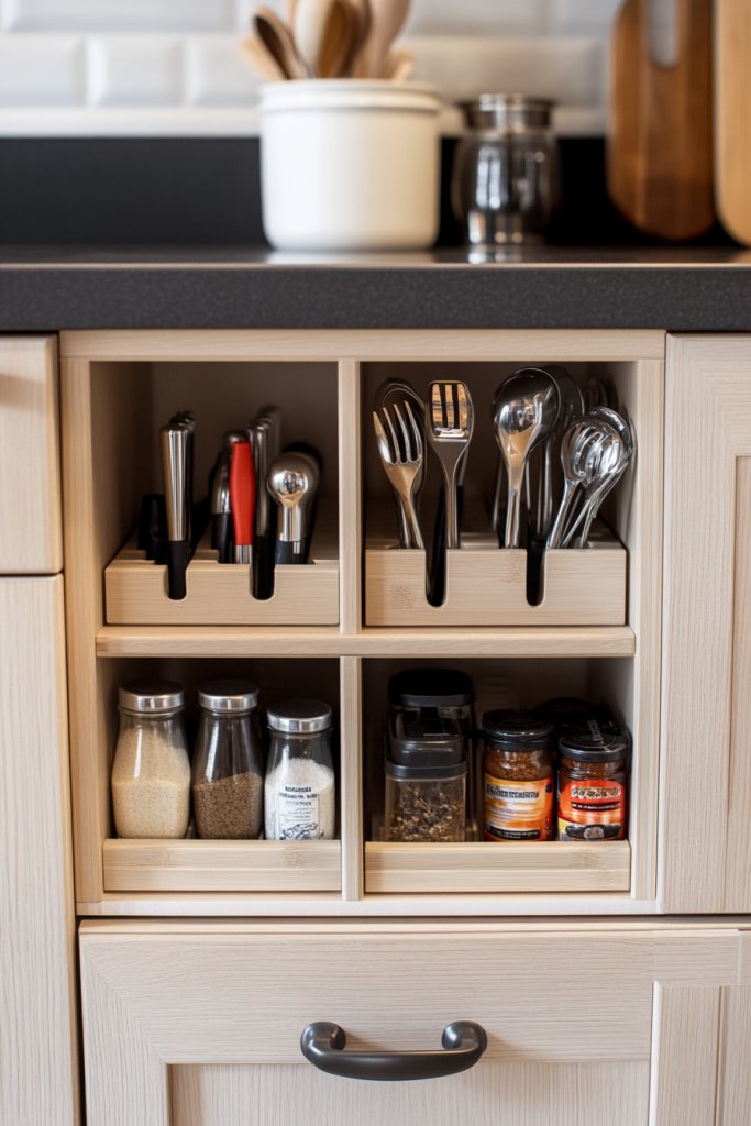 Picture stackable containers, adjustable dividers, and lazy Susans that fit perfectly into your cabinets. These pieces can be rearranged as your needs change, creating a tailored storage system. Clear containers make it easy to spot ingredients, while deep drawers hide bulky items. The result is a neat, organized space that looks as good as it functions.