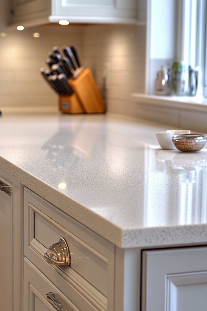Picture a sleek quartz countertop in a neutral tone, with subtle flecks that catch the light. Its smooth surface resists stains and scratches, maintaining its pristine look over years. The seamless appearance creates a modern, minimalist vibe. Pair with matching backsplash and cabinetry for a cohesive aesthetic. It’s like having a high-end finish without the high-maintenance worries.