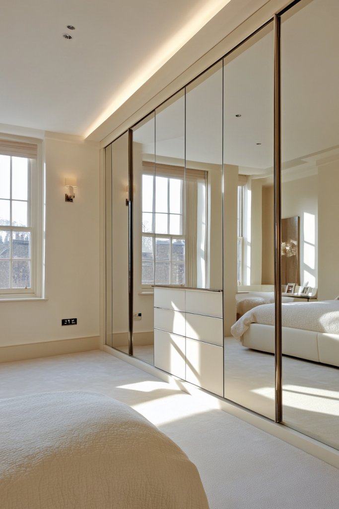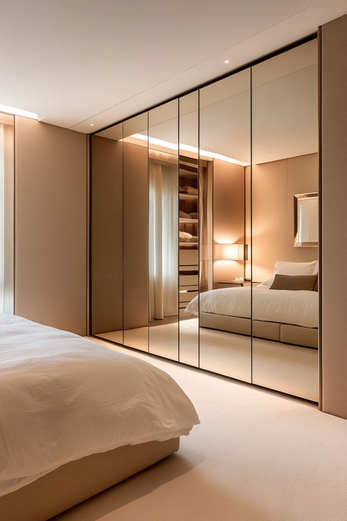 16. Mirrored Wardrobe Panels with Hidden Storage for a Seamless Look
