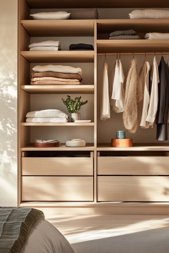 Imagine a wall-mounted system with open shelves and drawers, made from warm wood or matte metals. You see neatly folded sweaters, stacked shoes, and hanging clothes ready to grab. The open design creates a relaxed, airy feel, with natural textures and colors adding personality. The space looks organized but inviting, like a boutique display.