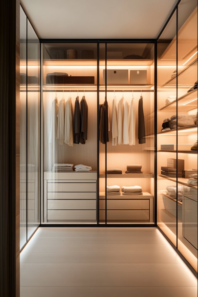 5. Minimalist Walk-In Wardrobes with Glass Partition Walls