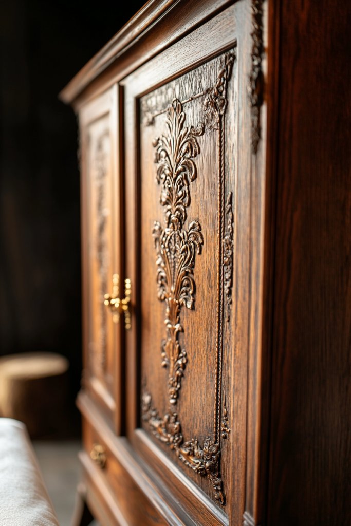 6. Vintage-Inspired Wardrobes with Ornate Carvings and Brass Hardware