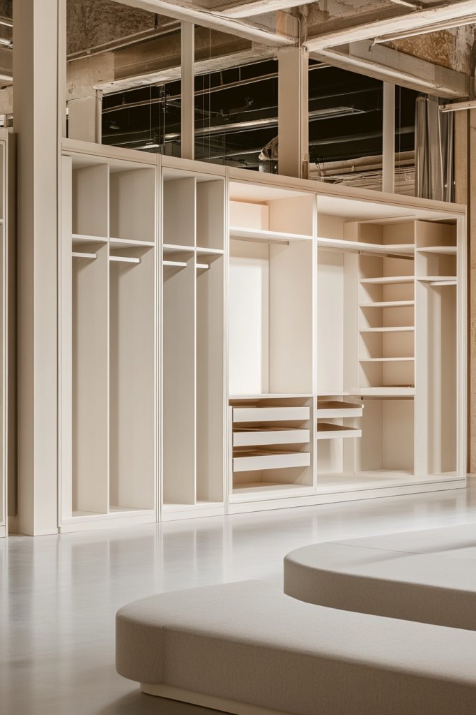 Imagine a sleek, grid-like setup with interchangeable shelves, drawers, and hanging rods. You can add or remove components with ease—think of it as building blocks for grown-up storage. The system adapts to your needs, whether you want more shelving for shoes or deeper drawers for sweaters. It looks clean, organized, and totally customizable.