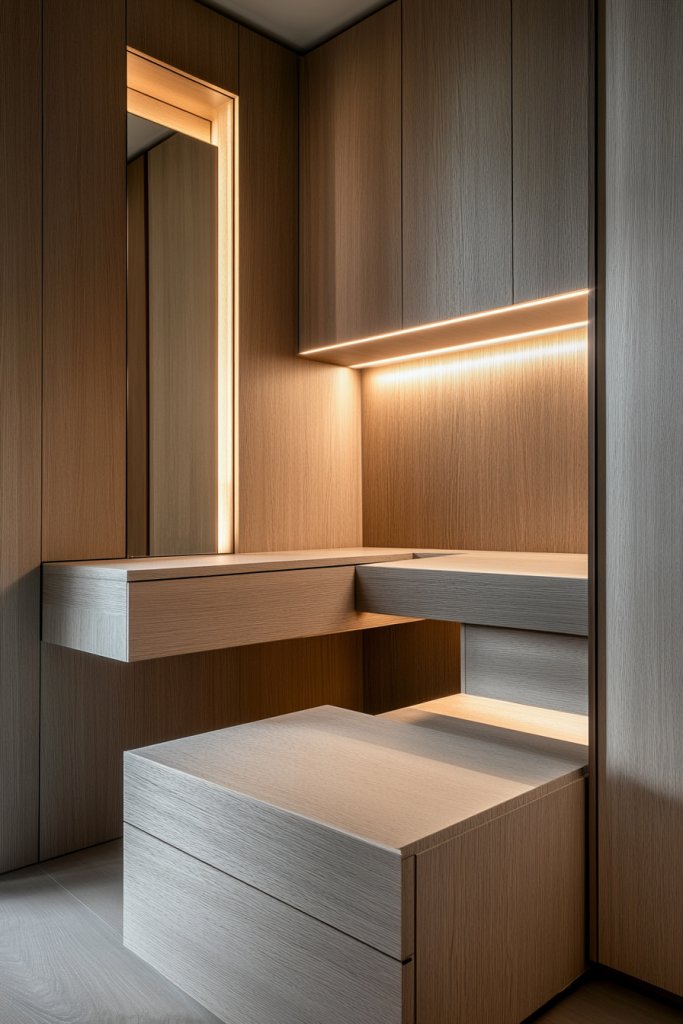 Imagine a wardrobe with a built-in mirror and a seamless tabletop surface that doubles as a dressing area. The drawers below hold your accessories, while the top surface is perfect for laying out clothes or makeup. The design is clean, with hidden compartments and minimal hardware, creating a clutter-free zone. It’s like having a personal stylist right in your room.