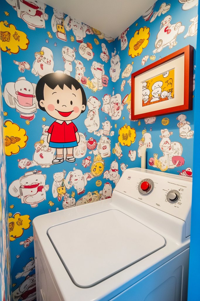 Want to add some fun and personality to your laundry space? Whimsical cartoon or patterned wallpaper can turn a boring corner into a cheerful retreat. It’s perfect for those who love a little humor and want their laundry room to feel less like a chore. Who says utility can’t be playful?