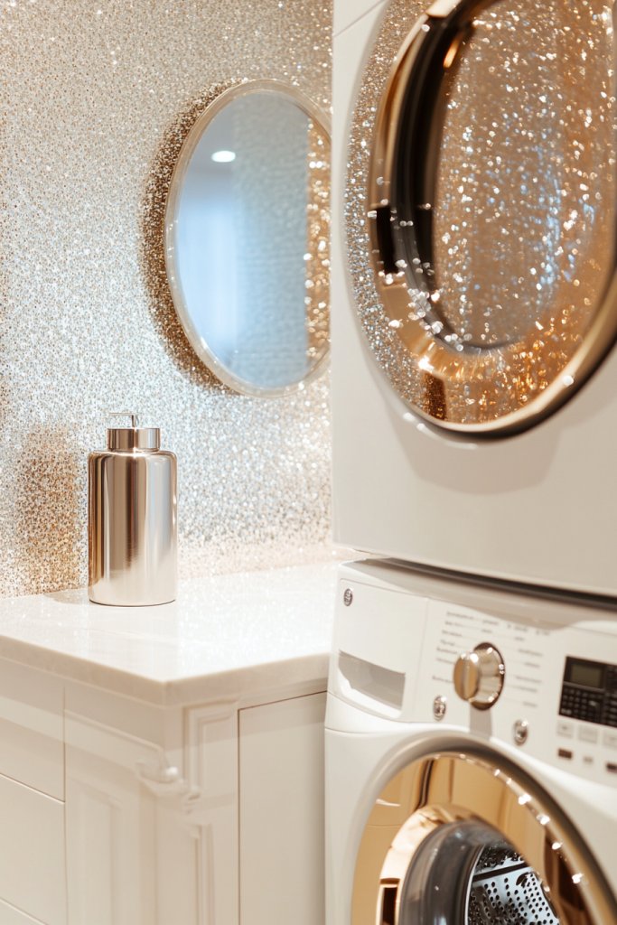 Metallic accents add instant glamour, making your laundry space feel more upscale and curated. It’s a small change with a big impact, transforming chores into a stylish experience. Feeling inspired? Elevate your laundry room with just a touch of shimmer.