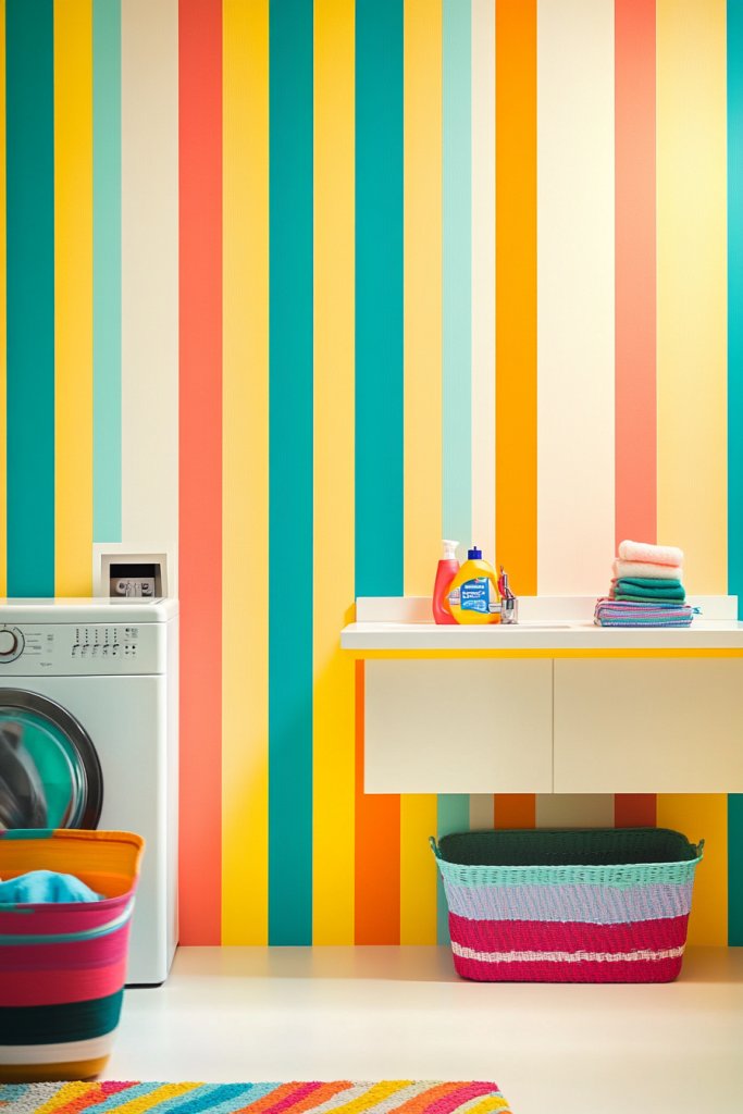 Bright striped wallpaper transforms your laundry room into an uplifting space that sets a positive tone for the day. It’s proof that a splash of color and pattern can make chores feel less like work. Ready to energize your laundry corner? Bright stripes are your go-to for a cheerful upgrade.