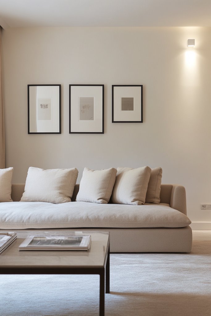 Imagine a living room with a sleek, low-profile sofa in soft beige, paired with a simple coffee table and minimal accessories. Walls are painted in warm taupe or crisp white, with unobtrusive storage solutions hidden behind flat-front doors. Natural light flows freely, highlighting the space’s airy openness. The overall look is uncluttered, sophisticated, and calming.