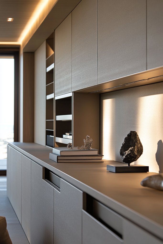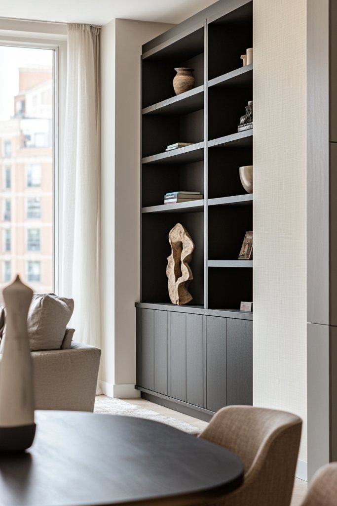 Imagine tall, sleek shelving units stretching from floor to ceiling, filled with baskets, books, and decorative boxes. Wall-mounted cabinets or floating shelves hold essentials and decorative items without crowding the room. The vertical arrangement draws the eye upward, creating a sense of height and openness. The space feels organized yet inviting, with everything within arm’s reach.