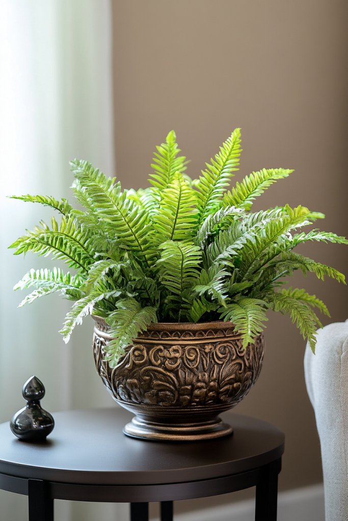 Picture a shelf lined with faux succulents in modern ceramic planters, or a tall, lush faux fern in a decorative basket. The greenery’s vibrant hues mimic real plants, creating a lively, inviting atmosphere. The textures—soft leaves, smooth pots—add layers of visual and tactile interest. The space feels fresh, vibrant, and full of personality.
