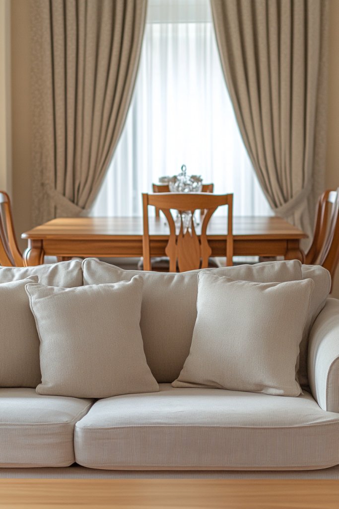 Picture a room painted in warm neutrals, with soft beige walls complemented by cream-colored furniture and subtle accents in taupe. The dining chairs echo the sofa’s fabric, while the curtains and rugs pick up a muted color palette. The result is a seamless flow where each element supports the others, creating a balanced, unified look. Light filters through sheer curtains, casting a warm glow over the harmonious space.