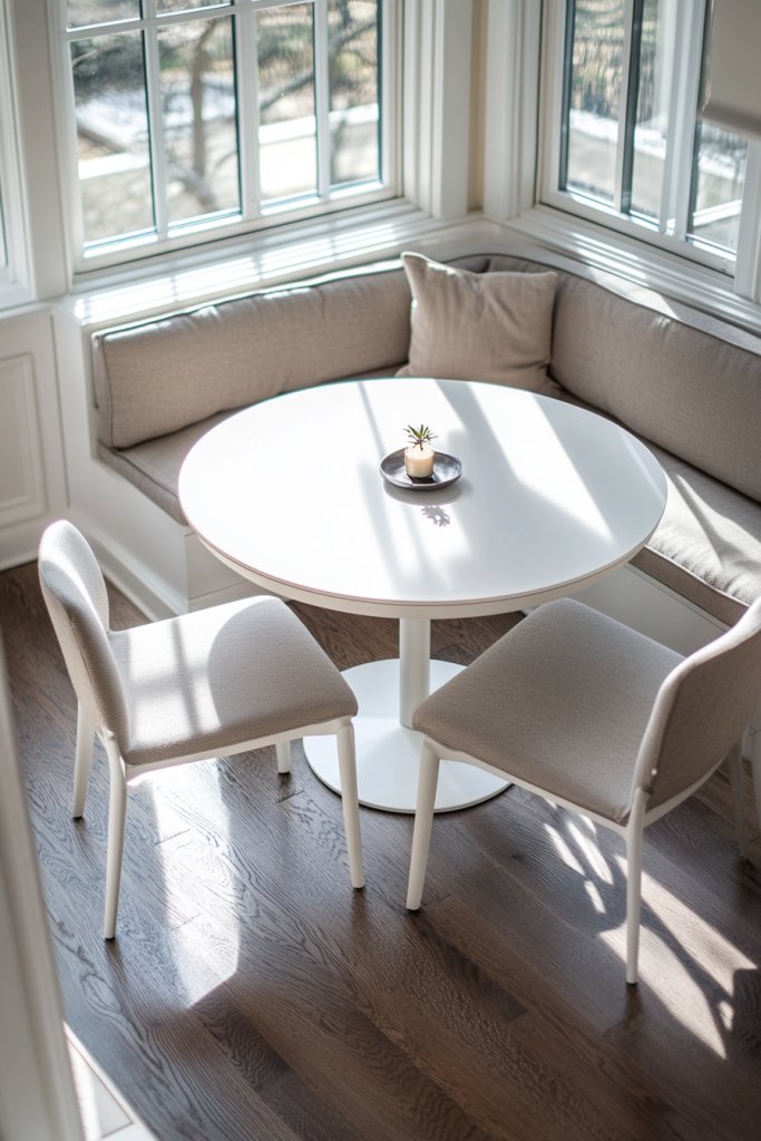 Envision a petite round table with a minimalist design, surrounded by modern, slim-backed chairs. The chairs have slender legs and open backs, creating an airy feel and making the space appear larger. The table’s smooth surface reflects natural light, adding to the sense of openness. This setup invites easy conversation and effortless style, making your room feel both inviting and uncluttered.