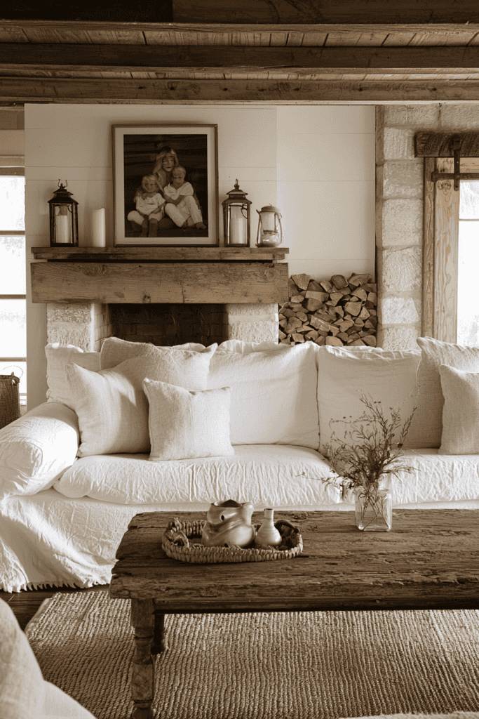 This rustic farmhouse-inspired living room is the definition of homey charm, with its blend of natural materials and cozy accents that evoke a sense of tradition. The sofa, dressed in crisp white linen with oversized pillows, exudes relaxing simplicity against the backdrop of natural stone and wood. A rugged wooden mantel adorned with lanterns and a family photo gives the room a personal and welcoming touch, creating a heartwarming focal point.