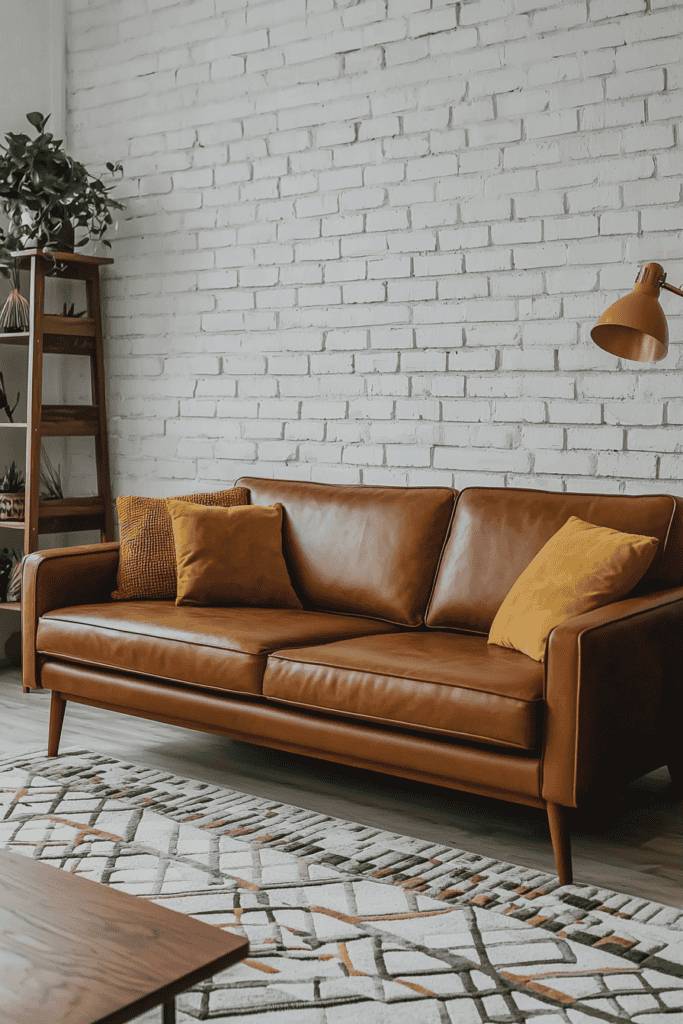 This mid-century modern living room combines vintage-inspired style with an effortlessly sleek vibe. The caramel leather sofa, with its clean lines and tapered legs, stands as a hallmark of mid-century design, offering a warm yet minimalist centerpiece. Accented with mustard yellow throw pillows, it introduces playful pops of color and creates a cozy seating area. The white-painted brick wall in the background adds texture and character, perfectly complementing the clean aesthetic.