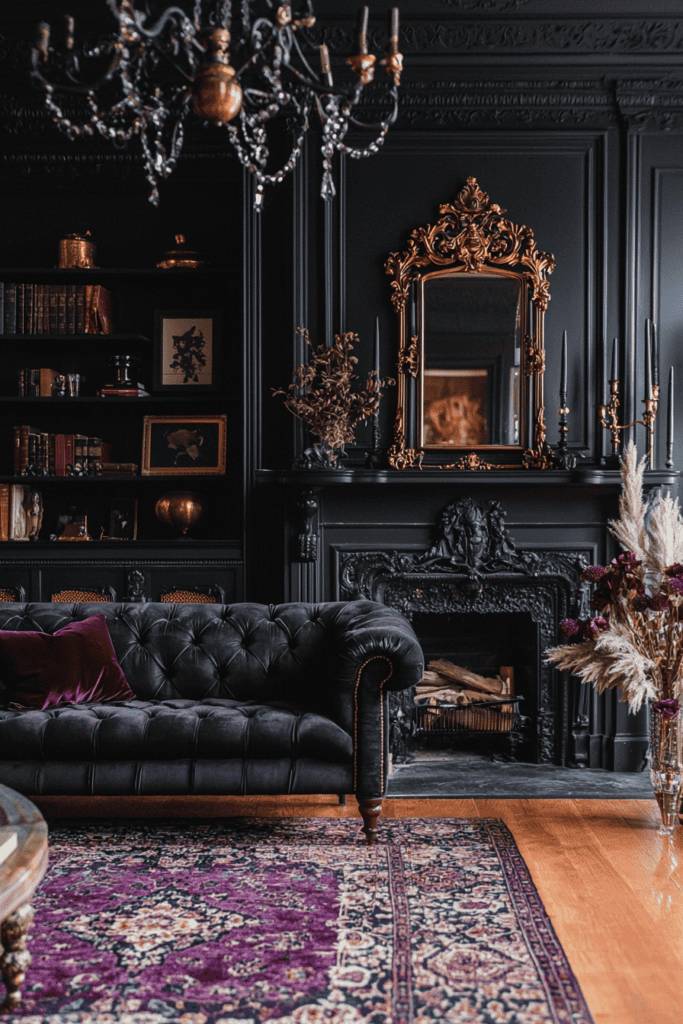 This moody and sophisticated living room captures the essence of gothic opulence with its deep black walls and intricate architectural detailing. The gold-framed mirror above an ornamental black fireplace serves as the pièce de résistance, reflecting light from the crystal chandelier and adding a glow of grandeur. The tufted midnight velvet sofa introduces an air of timeless elegance, softened by rich velvet throw pillows in shades of plum.