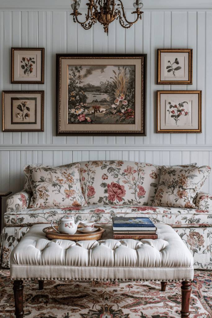 This charming living room takes inspiration from the cottagecore aesthetic, with a focus on soft florals and a cozy, nostalgic ambiance. The floral-printed sofa and matching throw pillows set a whimsical tone, beautifully complemented by botanical artwork in ornate gold frames adorning the beadboard wall. The soft palette of ivory, blush, and green creates a tranquil atmosphere where serenity meets sophisticated charm.